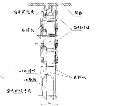 微介質(zhì)型隔倉板進(jìn)料側(cè)裝置又扇形的進(jìn)料篦板(篦板6~8mm)進(jìn)行物理的粗篩,其后裝有一層2mm厚的細(xì)篩板(篦縫2~4mm),進(jìn)料篦板與細(xì)篩板之間有一定的空間方便篩分。該隔倉板中心裝置有1個(gè)中心卸料堆,另出料端扇形襯板的篦縫與進(jìn)料端相同,以加大通風(fēng)面積和過料能力,微介質(zhì)型隔倉板結(jié)構(gòu)見下圖: