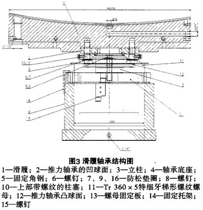 6、每個支座4個滑履軸承的結(jié)構(gòu),方便我們檢修和更換滑履軸承,哪一個滑履軸承壞了,需要更換,將下圖中特細(xì)牙螺紋螺母(11)擰松,將它總高度下降,即可抽出,不必像主軸承或雙滑履支承那樣,將球磨機筒體抬起才能更換。因為抬起球磨機筒體就要將前面與進(jìn)料裝置,后面與主減速機的聯(lián)接都要拆卸,檢修完畢又要重新找正,再恢復(fù)這些聯(lián)接,工作量很大,需要時間長。
